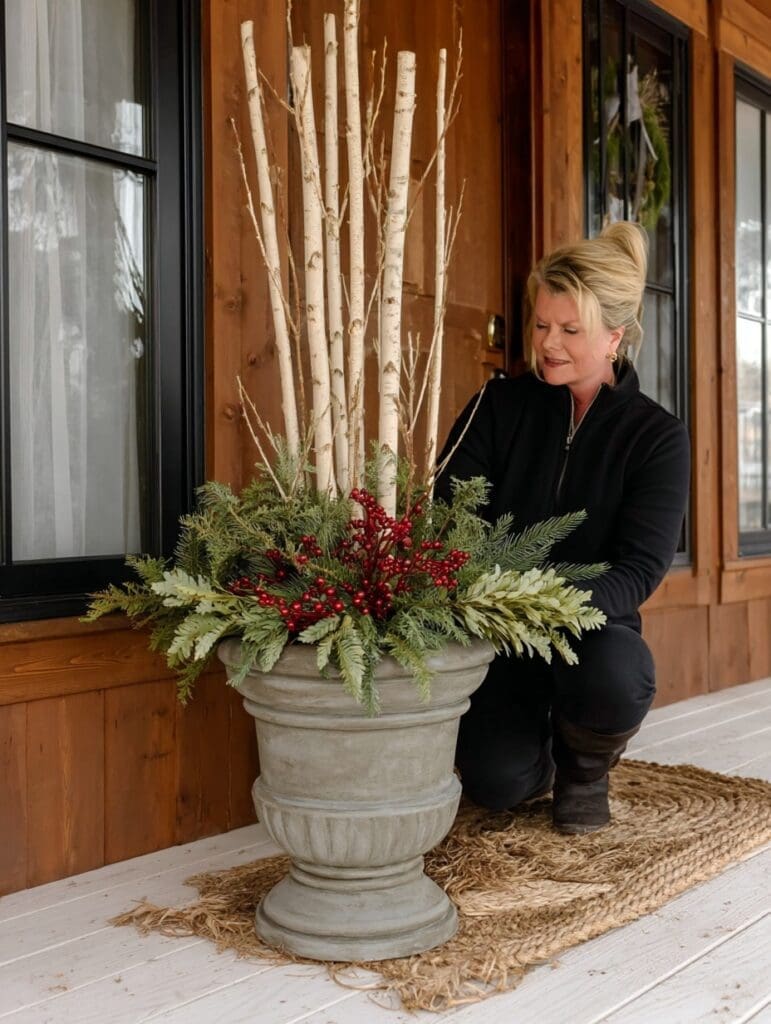 As winter settles in, I come back to a tradition that grounds me. I gather evergreens, red sumac, birch logs, and winter grasses from the woods near my lake home and shape them into porch pots. The materials are simple, yet the process feels calming and creative.